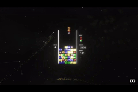 “Crystalis VR is a game inspired by retro puzzlers like Columns and Tetris, with the goal of combining a retro game to life in a synesthetic experience full of color, movement and sounds where the player is in the center of the universe. This is a non violent, casual and replayable game, that also includes an online leaderboard component. A thematic room for social VR was built to host meetups, and to reinforce the idea that the internet can be a place and that events that happen in one experience can have repercussions in others. In this case the leaderboard on the wall is the same as the one from the game.”