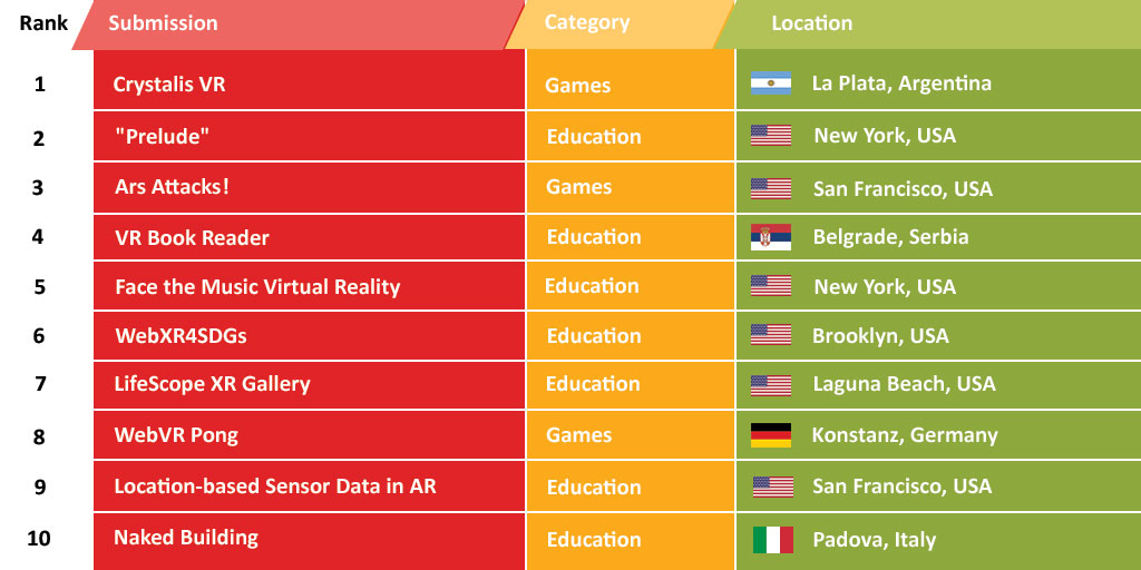 The competition ran from May 25th to July 31st, after which the top 10 most popular concepts were sent to a panel of 16 industry WebXR experts, influencers, and industry leaders to rank according to 4 criteria: technical complexity, polish & design, originality & innovation, and quality of immersion. In addition, “brownie points” were also awarded to concepts that included special features like supporting multiplayer, implementing progressive enhancement, and enabling accessibility (e.g. visual, hearing, and/or motor physically impaired users).