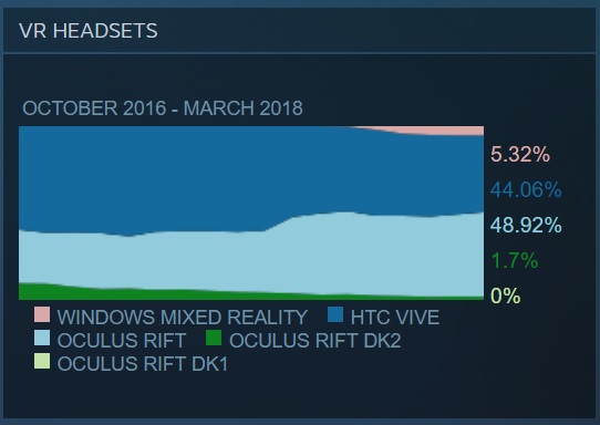 Interestingly enough the total percentage of Windows MR headsets used is actually down a slither from 5.36% to 5.32%. The Rift’s second development kit (DK2) is also still going strong with 1.7%. Seriously, who is still using a DK2? Get that person an upgrade!