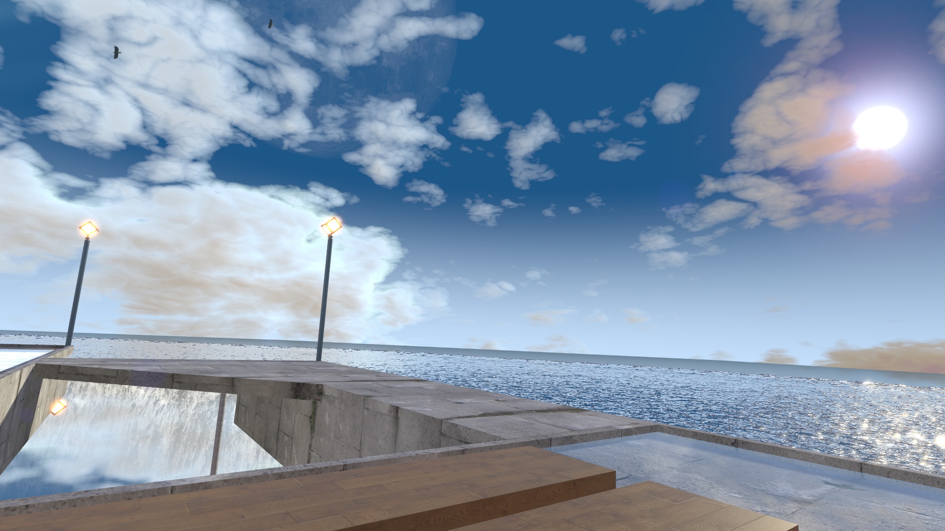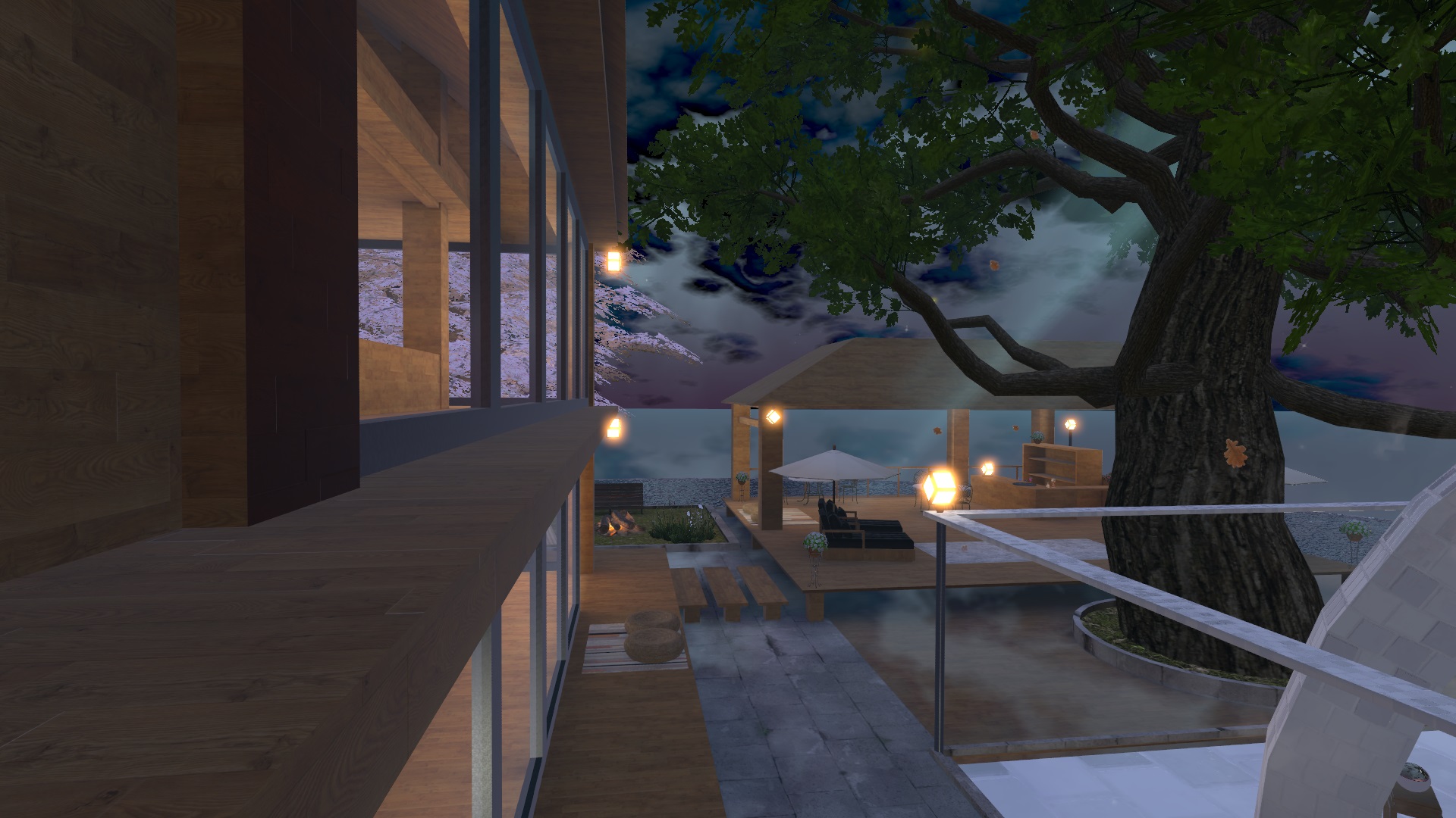 How do I summarize Home of the Time? It’s basically a floating island, surrounded by water, and equipped with an automated day/night cycle. The interior space is spacious and homely for a VRChat world. At the top, you can find an area with beds to hang out in. Outdoors, there is an entire garden area with statues, a patio, and greenery.