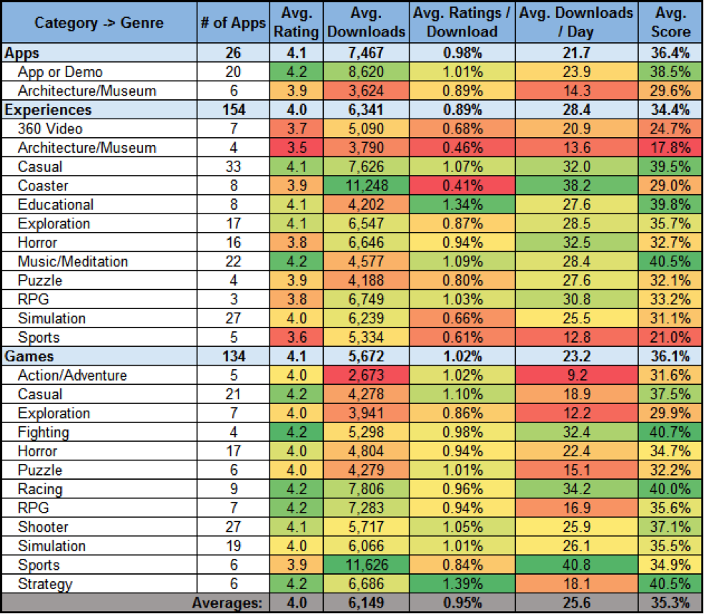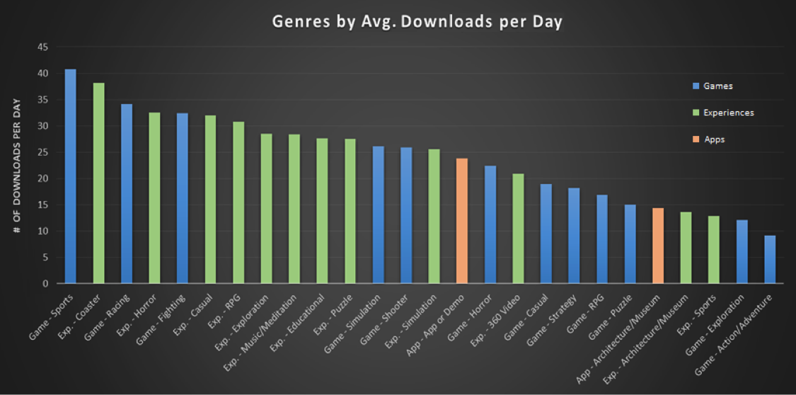 As Carmack has suggested, you can see that Experiences are averaging 28.4 downloads per day, while Games are only averaging 23.2 downloads per day. However the quality metrics are slightly lower for Experiences. That suggests that while the demand for Experiences is high, most developers haven’t yet learned how to craft a high quality Experience in VR yet. Specifically Coasters seem to be quite popular, though suffer from relatively poor quality metrics (as you might expect).