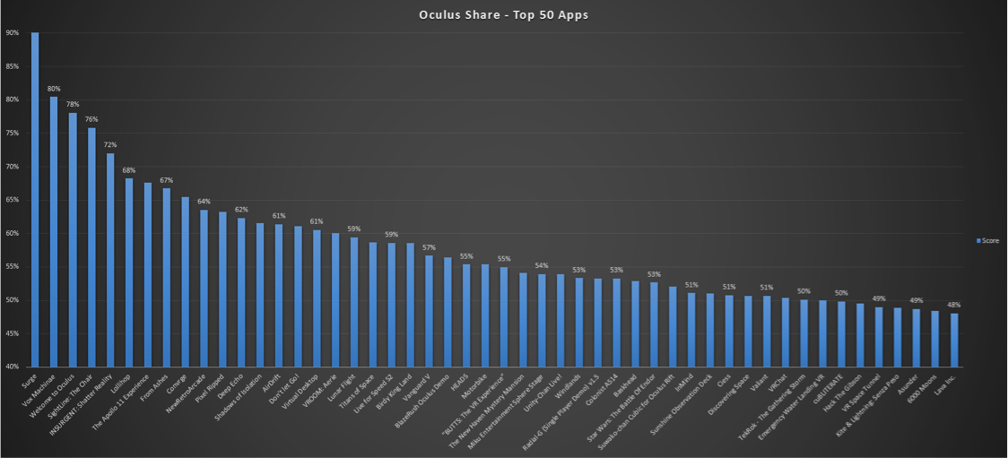 I wanted to get a better sense for what content was performing well. Oculus provides a Top Rated list, which is helpful, though they also provide other interesting data. I did some analysis of the available data on Oculus Share, and made up a relative scoring system. I simply called it Score, which is represented as a percentage.
