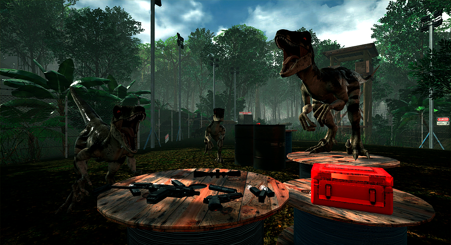 Island 359 (coming this summer to HTC Vive on Steam Early Access) looks deceptively simple. A helicopter drops you off on a dinosaur-infested island, and you have to find weapons and other supplies to survive. Pretty straightforward, right? But Island 359’s wave-based survival mode is a little more complicated than that. You can freely move around by selecting a point in front of you and sprinting at superhuman speeds to get to it. After killing a certain amount of dinosaurs, a loot crate will drop from the sky. Inside, you’ll find new weapons, gun attachments, health packs, and other items.