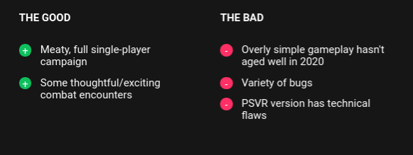 More damning, though, is that the game simply doesn’t feel built for a 180-degree tracking setup, with enemies spawning in from behind and killing you before you can properly react. Plus in some environments I noticed even the geometry suddenly shifting into view. The game is still playable on console, but it’s definitely inferior to the PC edition.