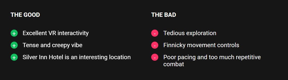 VR Bros has the pieces for something really great with A Wake Inn, but just falters in stringing things together in a way that remains compelling. The core design ideas are fantastic in terms of how you move through the world, interact with the environment, solve basic puzzles, and creep through the halls, but that thoughtful nature is discarded once a weapon is in your hand and the once terrifying mannequins are just combat dummies waiting to be mauled. A Wake Inn isn’t as terrifying as it could have been, but it’s still an interesting look at some clever VR mechanics others could learn from.