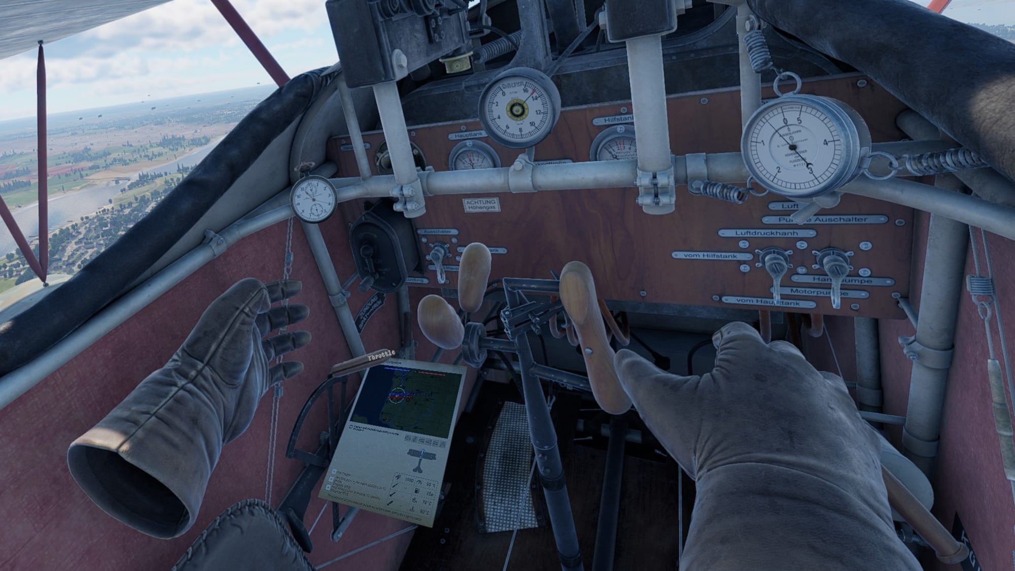 I had only two issues with Aces of Thunder. The first is a natural consequence of enjoying what there is - which is to say I wanted more of everything - WWI planes and maps especially. But my main bugbear was the sparse and often unhelpful presentation away from the meat and potatoes of the main game. There really isn't much assistance to speak of at all - no tooltips, no tutorial - and the game starts without fanfare and dumps you unceremoniously into the middle of a makeshift airfield, with only distant birdsong and some old gramophone dirge to stir you to action. That action in common with many VR games is to make your selections from an unconvincing clipboard that’s been surgically attached to your flying glove. The problem is that navigating the various menus with said glove is clumsy in the extreme. It’s like trying to operate a phone with a sausage. Sure you get used to it - because you have to - and if you just want to pick a plane and take to the skies you can just about accept the lack of a more precise pointer system, but for anything more than that - such as tweaking the graphical settings, or God forbid, reassigning controls to the various axes of your HOTAS and rudder setup, well, prepare yourself for an exercise in fist-shaking frustration. And don’t think it’s any easier reassigning controls in the flatscreen mode either, because it most definitely isn’t.