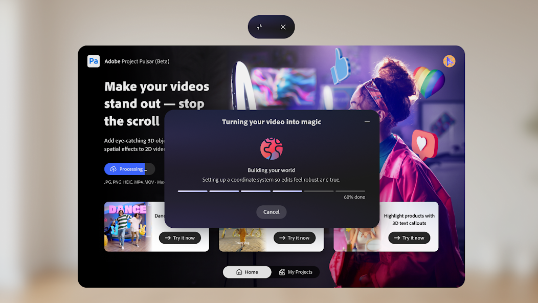 Project Pulsar (beta) from Adobe is a Spatial FX and 3D compositing app for social video content creators. It puts powerful tools at your fingertips, so you can stand out, stop the scroll, and captivate your audience. Create studio-quality 3D text, assets, and spatial effects in minutes—no VFX experience required