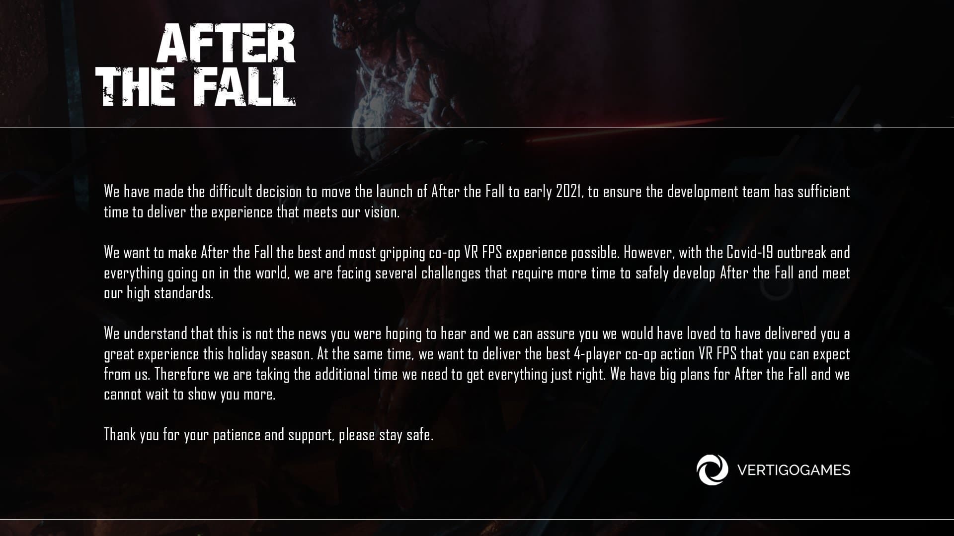 “However, with the COVID-19 outbreak and everything going on in the world, we are facing several challenges that require more time to safely develop After The Fall and meet our high standards,” the message reads.