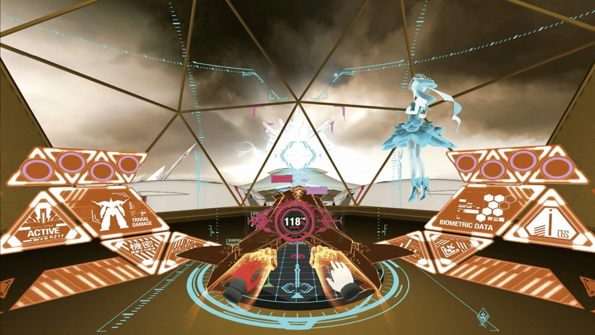 Though short, my demo for Altdeus suggests this is a key area MyDearest is tackling for the sequel. The 10-minute slice puts me in the heart of a city-wide battle, with protagonist Chloe commanding one mech and joining a companion to fight an orb-like alien. What action is here is light, but it does go some way to giving you a sense of being inside the story. Panels are activated with smartphone-style sequence unlocks and you can flail your giant mechanical arms by moving your real ones. At certain points, you’re asked to execute specific gestures to prepare attacks, giving the entire sequence a Saturday morning cartoon vibe.