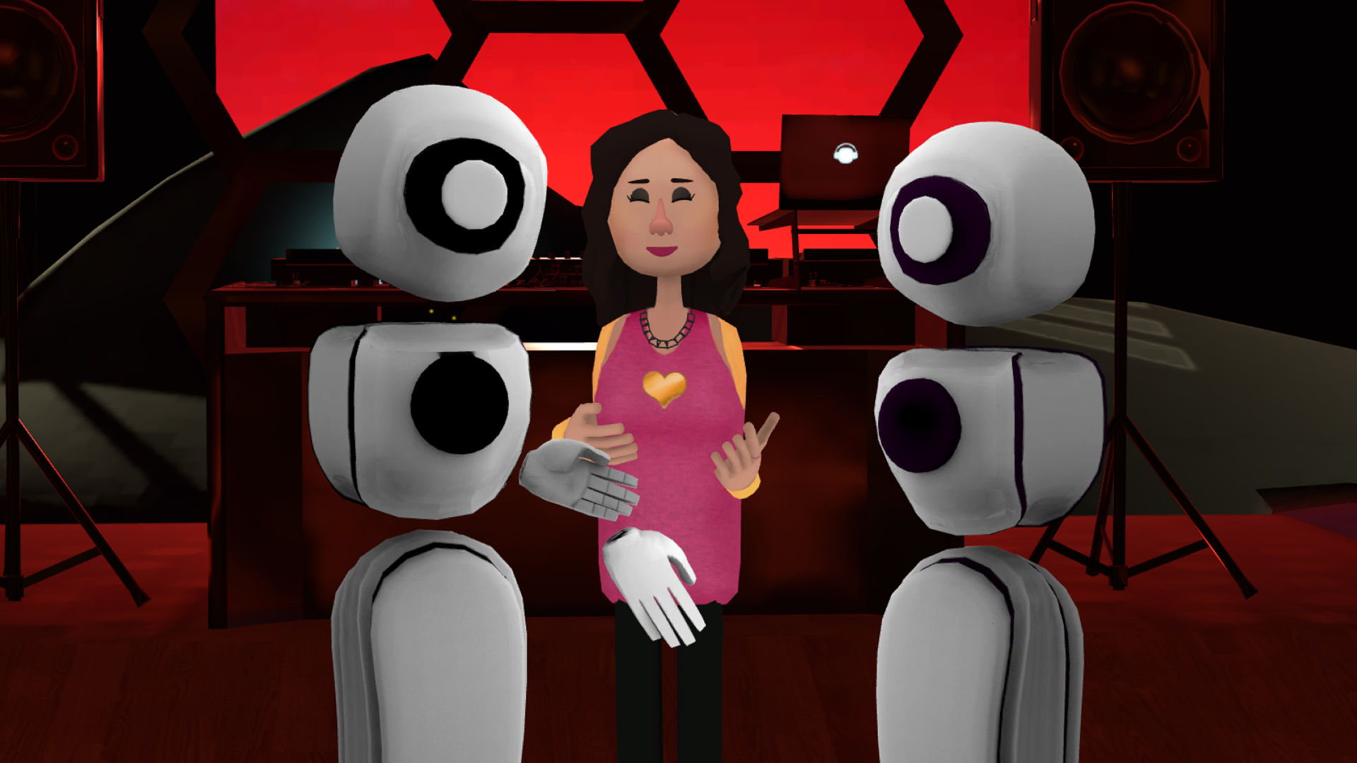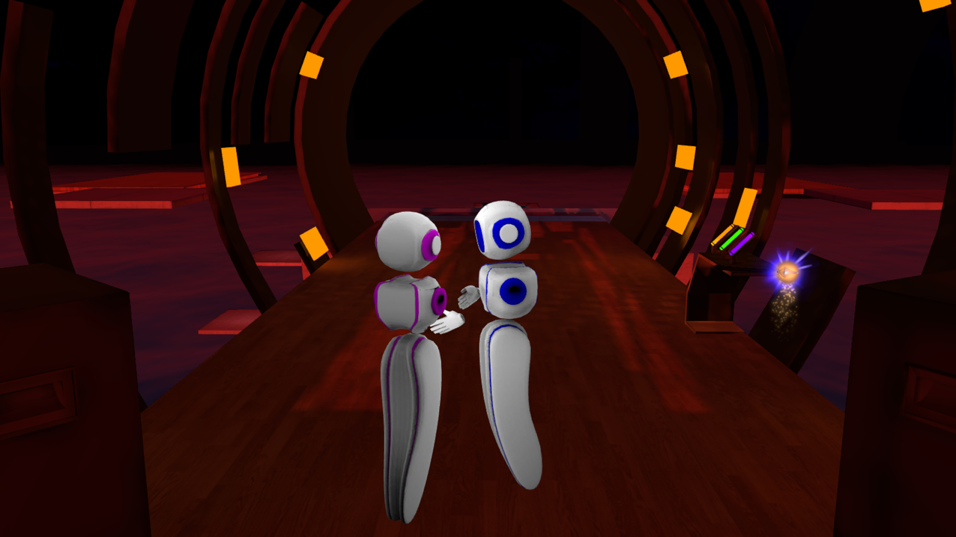 “You know, I quite like the idea of not being a humanoid,” explains Shervington. “She’s a pink and white robot and I’m a blue one. The psychological connection is not only the physicality and it’s not only environmental, it’s about subtle things like your voice and your tone, and you layer that familiar physical presence you know onto that avatar. It was different meeting her in VR to what I expected. I looked at her, with those big eyes, the way the head moves, and the lights go on and off as she speaks, and it’s cute! And it’s because she’s behind there. I love her, so why wouldn’t I love the representation of her?”