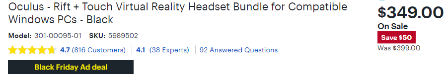 Best Buy USA are currently offering $50 off the Oculus Rift+Touch bundle, bringing the price from $399 to $349. The offer was part of Best Buy’s Black Friday lineup, but is available already.