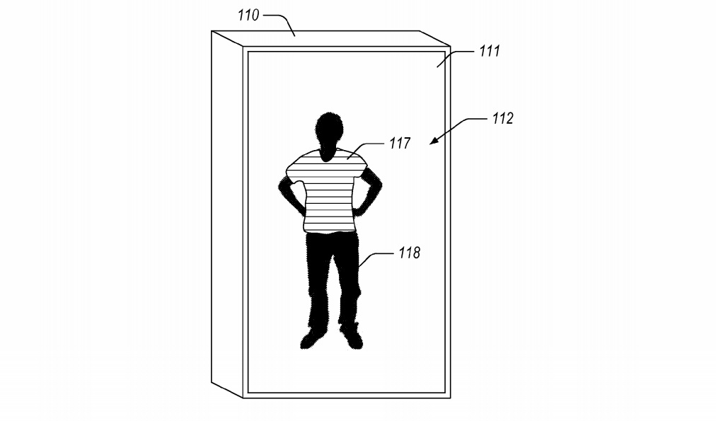 The patent, first spotted by GeekWire, provides a ‘blended reality’ view of yourself wearing stylish outfits in virtual locations. A camera at the top of the mirror tracks the user’s body and then a screen behind the reflective panel works with projects to illuminate the picture. You could, for example, visit a virtual beach and then have the mirror dress you for the part with virtual t-shirts and shorts that follow you as you walk around. It’s not too unlike a Snapchat filter that paints over your face, for example.