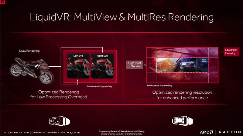 Underneath all of these things are a couple enhancements to Liquid VR, AMD’s collection of features around seamless compatibility and optimization of VR specific experiences. Multi-view and Multi-res rendering both collaborate to reduce excessive and redundant processing to enhance performance. TrueAudio Next provides immersive sound based on real-time physics, and Affinity adds a scalable experience for multiple GPUs by having each GPU focus on a separate lens in VR.