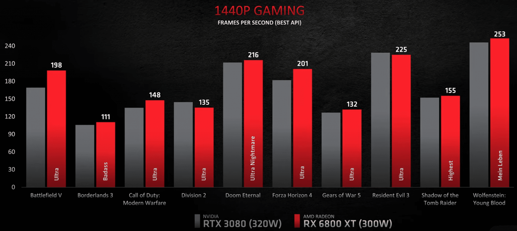 In this slide directly comparing RX 6800 XT to NVIDIA’s RTX 3080 at 1440p it’s shown as faster in Battlefield V, Borderlands 3, Call of Duty, Doom Eternal, Forza Horizon 4, Gears of War 5, Resident Evil 3, Shadow of the Tomb Raider, and Wolfenstein: Young Blood.