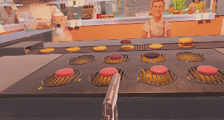 Each of these experiences would have been relatively simple to do in VR, but since this is The American Dream, it was a bit different. Flipping burgers with a gun felt very much like a simple, quick, arcade-style minigame. I shot them to flip them over and shot them again to get them on the bun before they burned. Shoot the sign and the order is sent on its way.