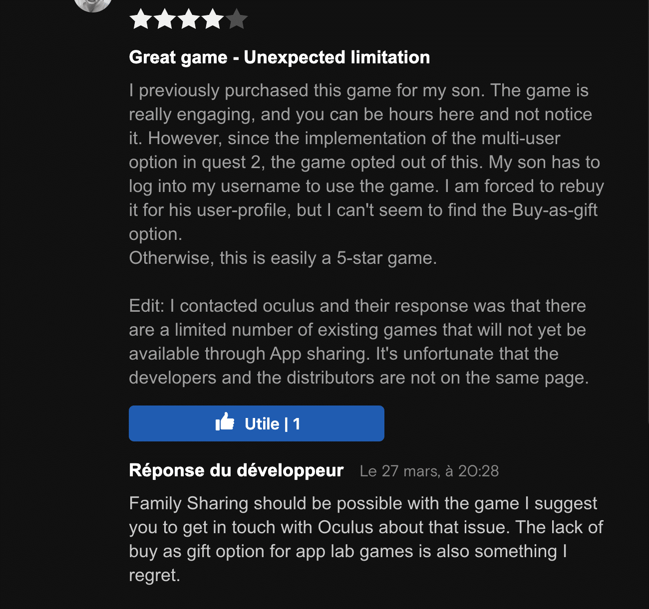 Each of these issues might seem like something small. But when they add up, they are not without consequences. For example I found a player who explicitly removed one star to a game because of two issues totally beyond the developer control, the lack of App Sharing and the inability to buy for a friend.