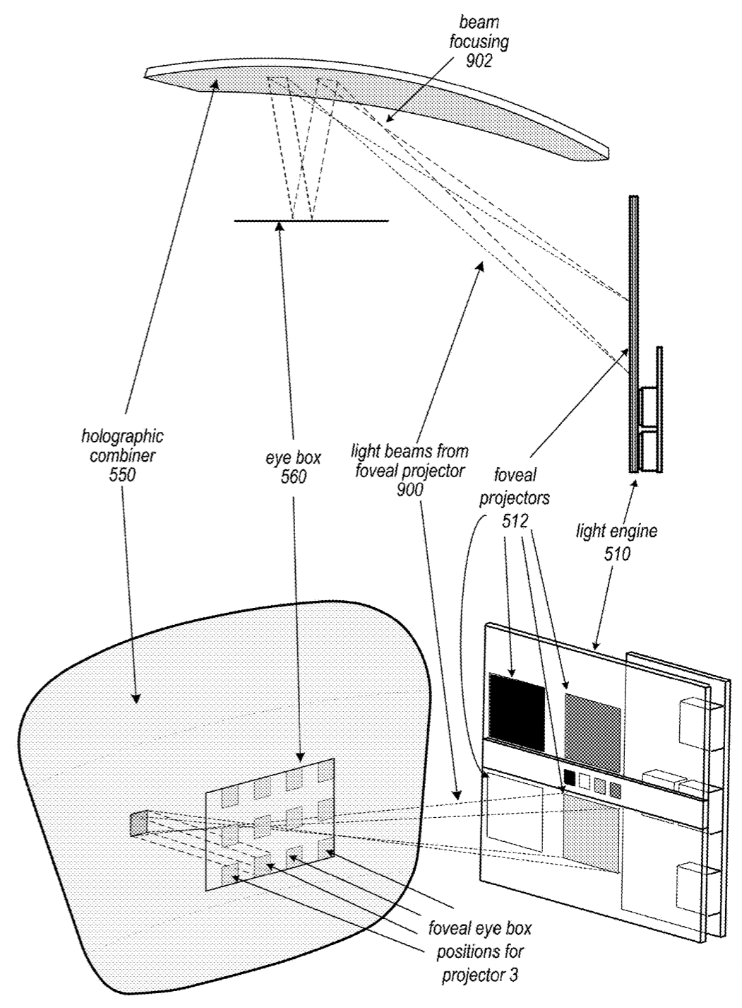 Crucially, some of the holographic projectors are “peripheral” projectors and the others are “foveal” projectors. Whereas the peripheral projectors direct low resolution imagery over 120 degrees horizontal field of view, the foveal projectors use higher resolution over an area of 20 degrees horizontal. The foveal image is sent to the position of the retina, which could be detected with eye tracking hardware. However, the patent notes that eye tracking may not be included to reduce complexity, in which case only peripheral projectors would be used.