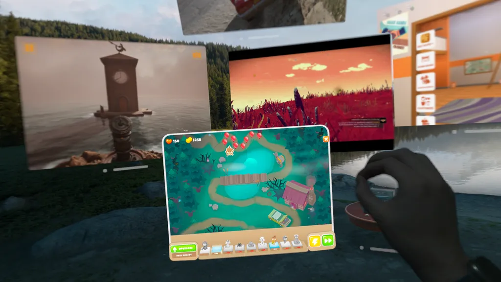 You can play Helldivers 2 on a giant floating screen via Steam Link while Solitaire or Stardew Valley floats nearby for a quick card game, or a bit of farming in between drops. For a change of pace, pull up a window into Myst island or Sayonara Wild Hearts and listen to the waves lap the dock or start to vibe with the music.