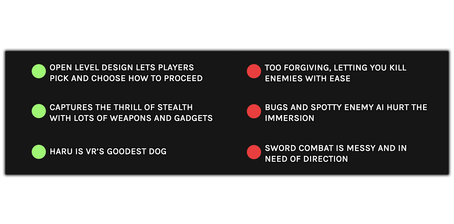 Let’s take a moment to talk about Haru. She is, without a doubt, VR’s goodest dog or, to be more accurate, wolf. She’s lovable in her doe-eyed affection and convincing in the way her fur and ears realistically ruffle to the touch. She’s also dependably loyal to your command, leaping on enemies without a moment’s hesitation and, yes, she’s inescapably goofy too. Sometimes that’s intentional like when playing fetch between missions and sometimes less so, like when walking vertically up a wall.