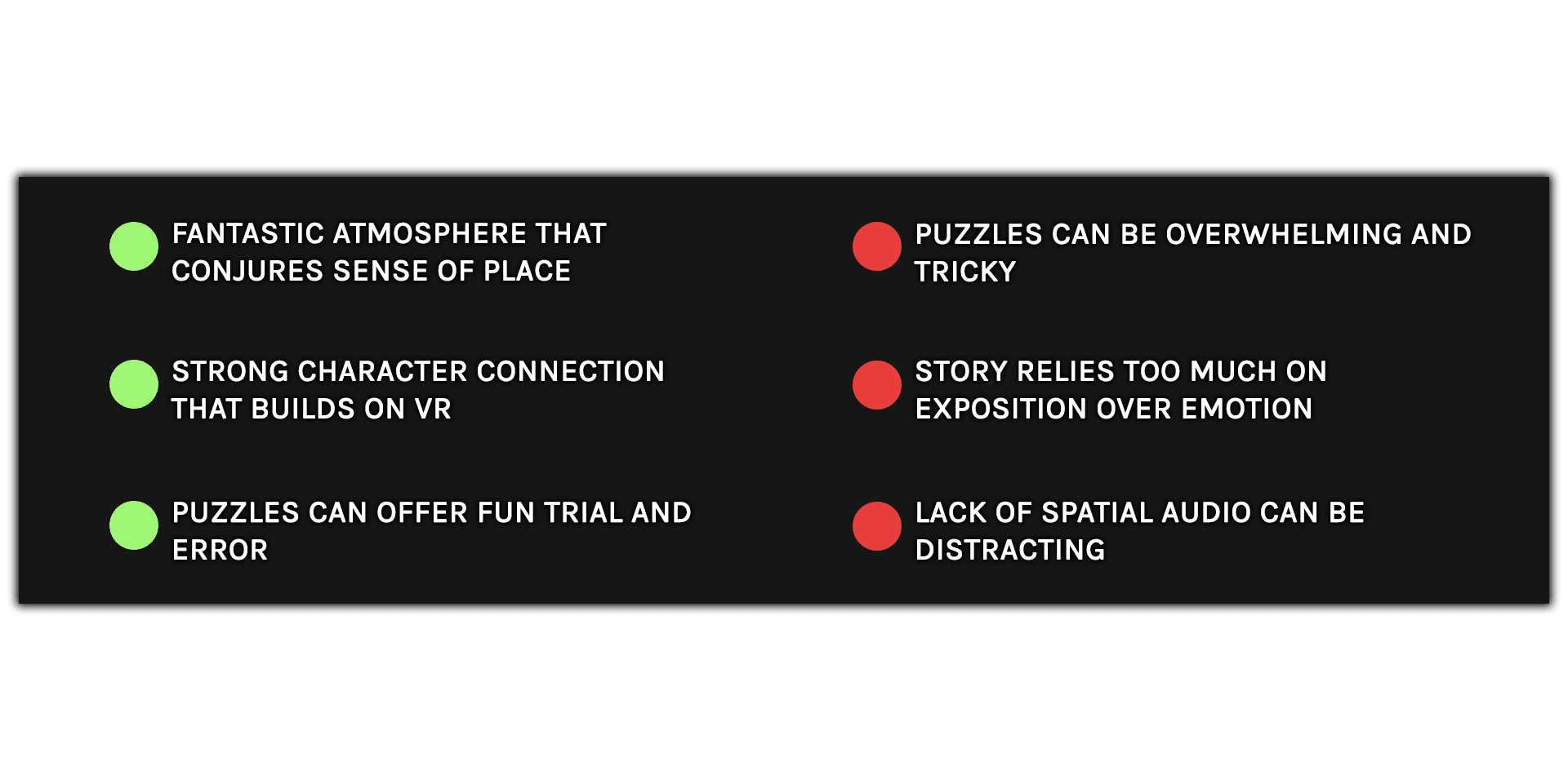 Arcsmith is about a lot of things: the joys of tinkering with gadgetry, the power of character connection in VR and finding strength in darkness. It wrestles with these elements with mixed results. Puzzles have a trial and error charm but can be overwhelming and finicky, while the game’s dialogue leans too heavily on exposition over emotion. But it is a genuinely admirable attempt to build something specific to the platform – a game that puts immersion at the heart of both its storytelling and mechanics and the result is a rare, convincing sense of place. It’s good to know that, in an era of explosive VR action and rhythm games, we haven’t lost sight of that.