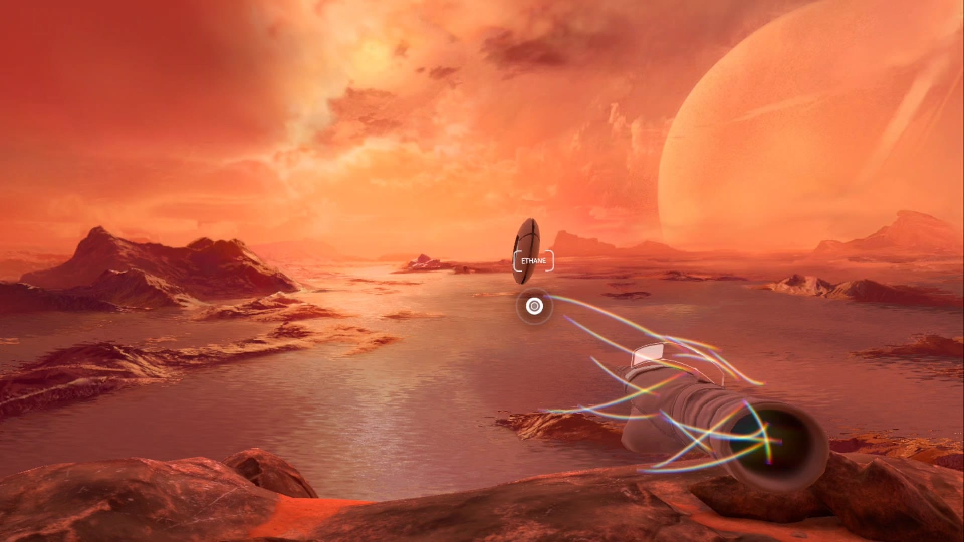 While there is some gamification to this experience, it feels rather light, like something added to keep players engaged in a narrative teaching them about various elements we've found on some of the more significant moons in our solar system. The gameplay aspect presents itself as a sequence of beaming down to the surfaces of moons and collecting elements to bring back to the ship for analysis. All of this collection is in pursuit of finding the right combination of elements that would come together to support life. Other than the scanning and collecting, tapping on virtual control panel screens to select the next destination is about as interactive as this experience gets.