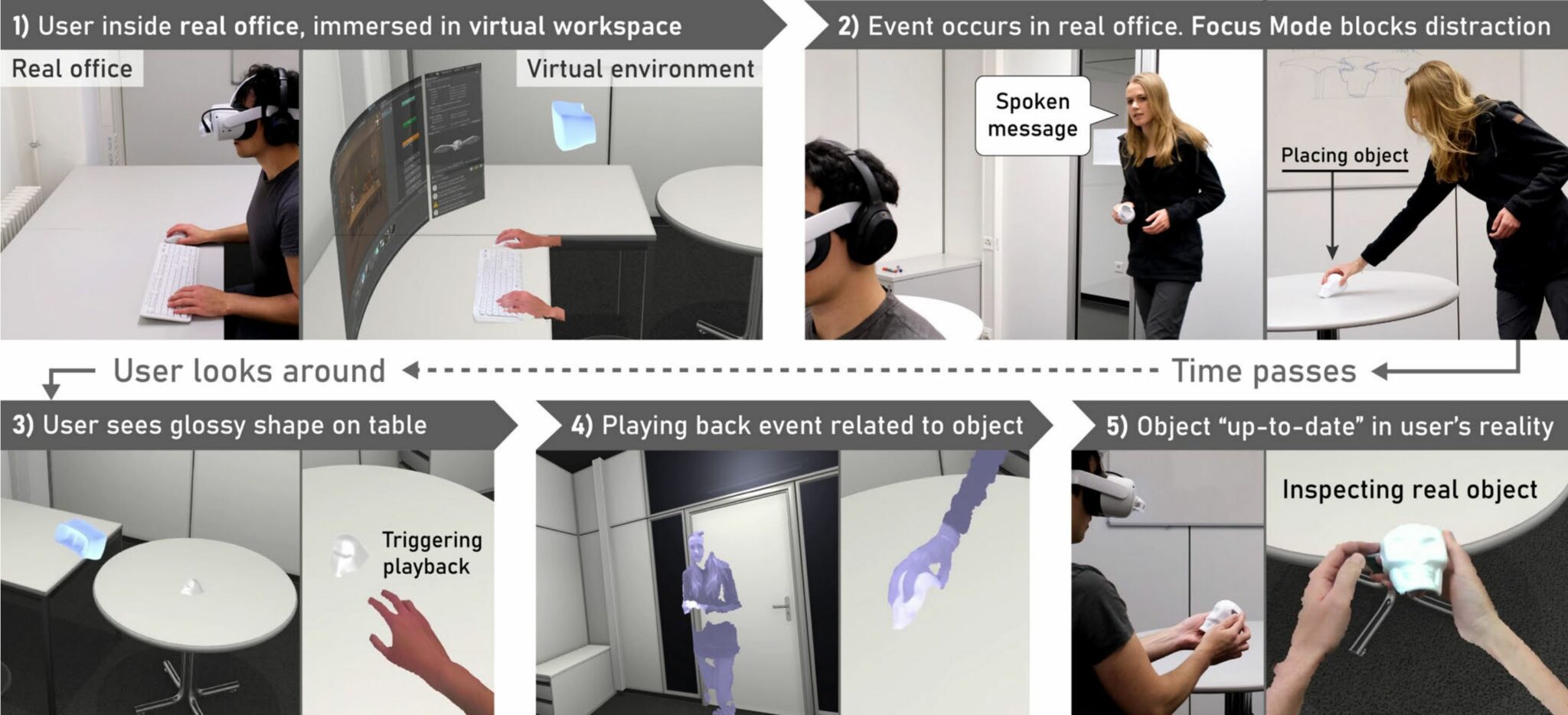 New research from the Sensing, Interaction & Perception Lab at ETH Zürich in Switzerland conceptualizes a work day with “Causality-preserving Asynchronous Reality“. The idea shows how environments laden with depth sensors could allow collaborators to annotate objects in the physical environment, essentially leaving messages for their colleagues to pick up in the future. The effect shifts time like the answering machines of the last century but places messages in context of the physical environment in which they were made, much like the holographic recordings shown throughout the Horizon Zero Dawn games.