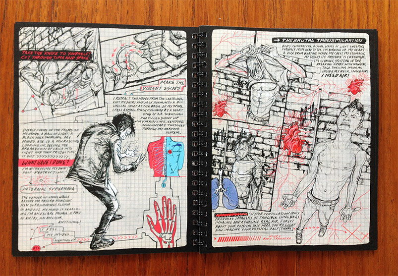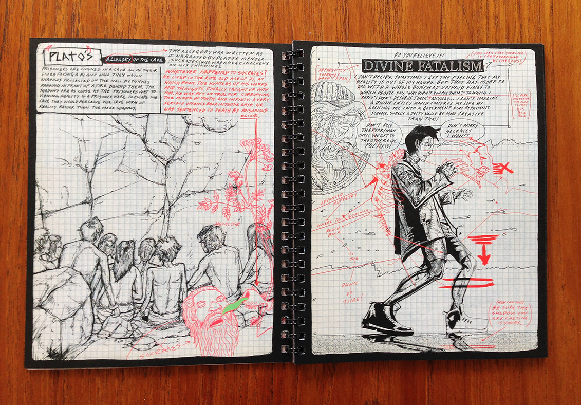 In the comic Modern Polaxis, the title character is a paranoid time traveler. “He believes our reality is a projection from another plane in the universe and his mission is to find the projectionist,” says Stuart Campbell, also known as Sutu, the book’s creator. “The book is designed to look like his personal notebook and he hides all his secret information in the layer of augmented reality.”