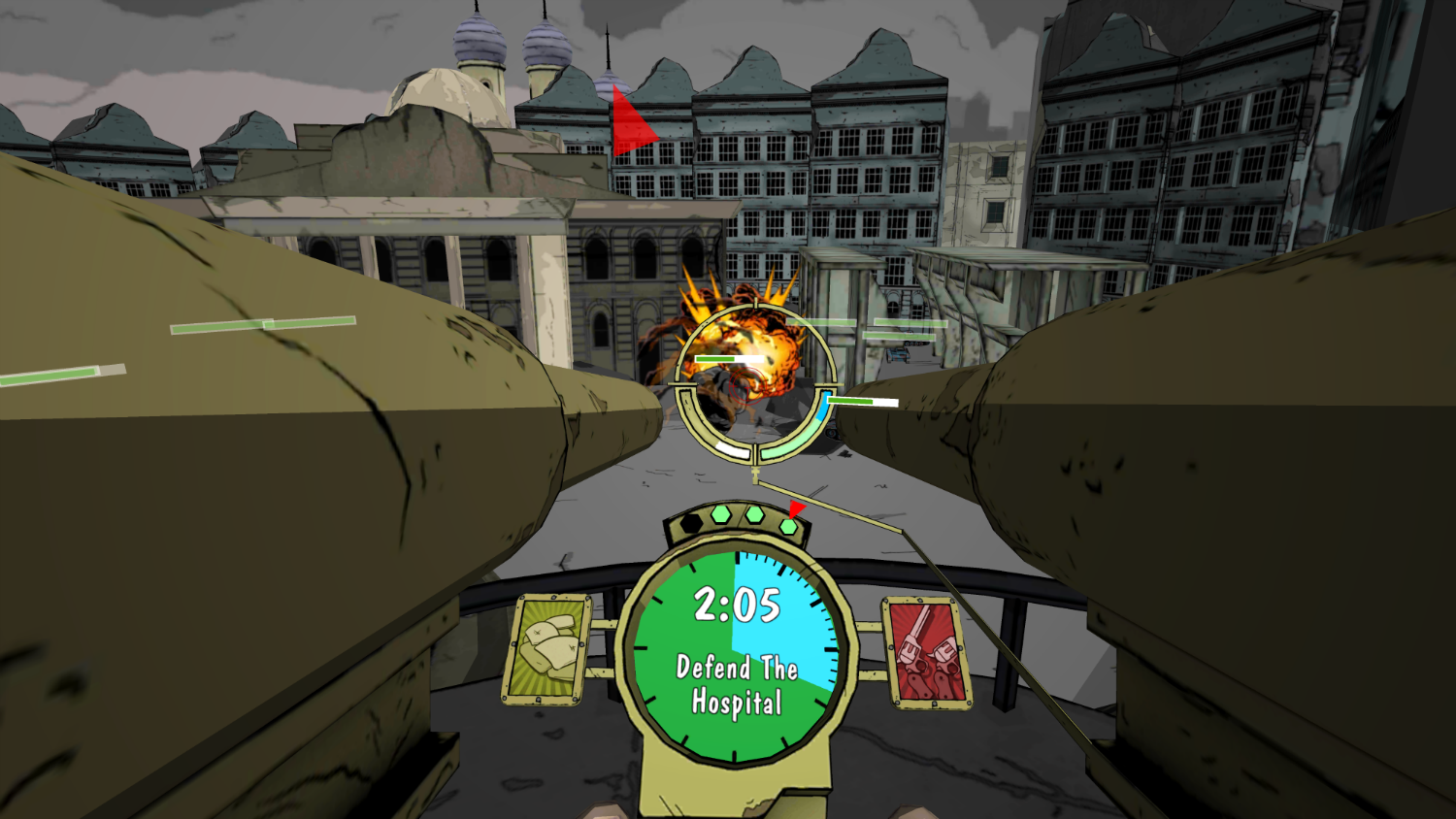 Salvo is a much livelier game, with cel-shaded visuals that really pop inside PSVR’s OLED display. It trades the back of an aircraft for stationary turrets, rooted to beach heads and more. You’ll have access to another machine gun as well as mortar and artillery fire but, crucially, there’s a bit of strategy in the mix. Before a mission starts you can place a selection of turrets in specific positions, and then switch between them in-game to get a better angle on some enemies or tackle foes more suited to their firepower.