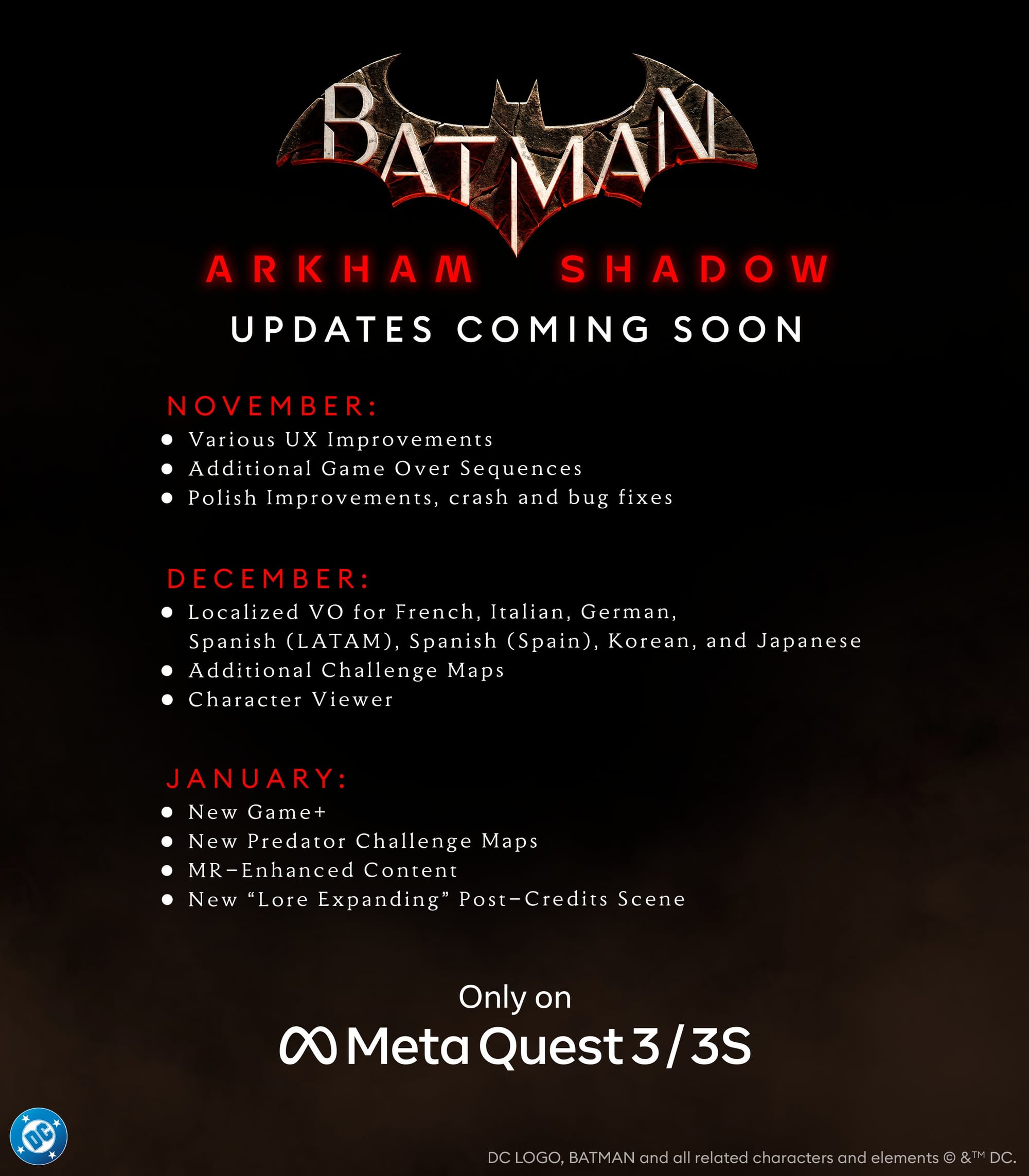 Batman: Arkham Shadow outlined its post-launch roadmap, confirming when to expect New Game+ Mode and more Challenge Maps.
