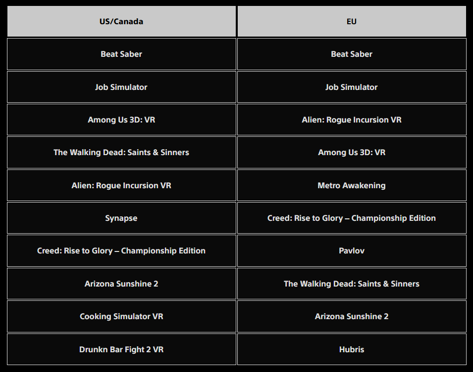 The full chart from the PlayStation blog can be seen here, mostly filled out by other mainstays like Pavlov, Job Simulator, The Walking Dead: Saints & Sinners, and Among Us 3D: VR.