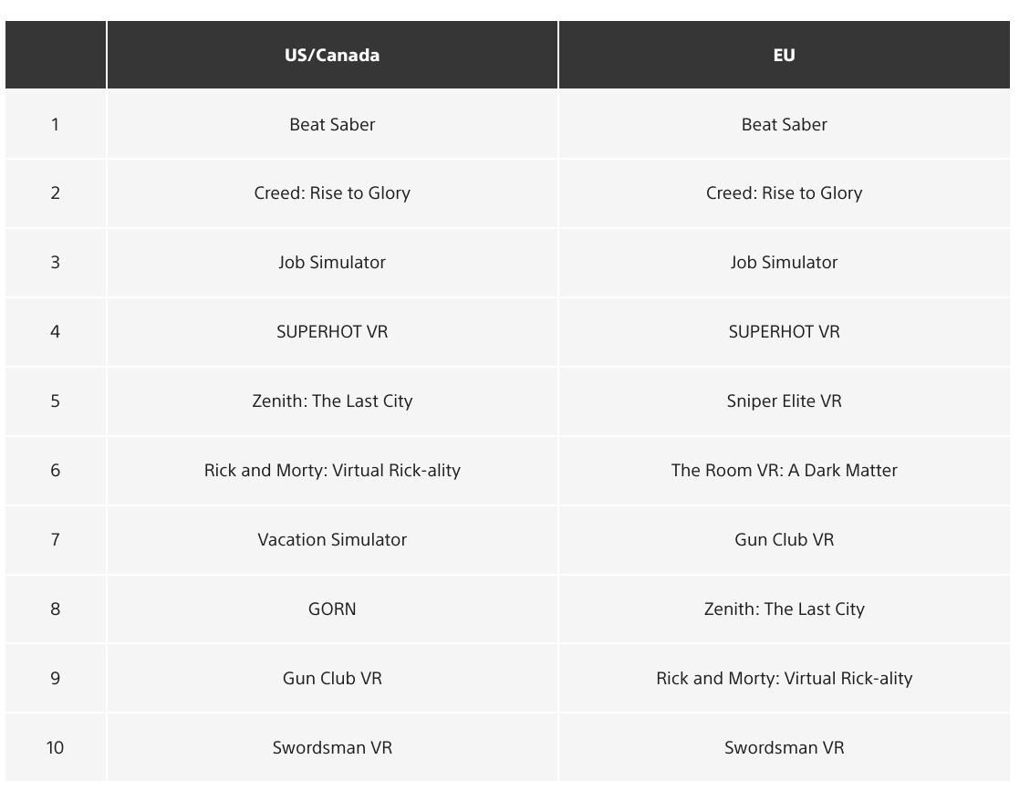 Zenith followed in fifth in the US and eigth in the EU. Rick and Morty, Gun Club VR and Swordsman VR all chimed in, too.