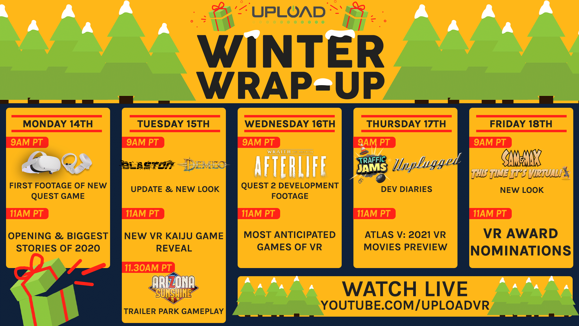 Head back to Upload tomorrow when Resolution Games will give us an update on Demeo and Blaston and, later in the week, we’ll be featuring Sam & Max, Wraith: The Oblivion – Afterlife, Unplugged and much more. Plus, don’t miss the reveal of our 2020 VR Awards nominations this Friday. Check out the full schedule below!