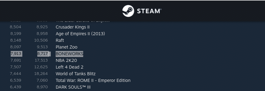 That position puts Boneworks ahead of even games like No Man’s Sky and Star Wars Jedi: Fallen Order at this point in time. Granted those games are available on a range of other platforms and old releases, but given you can only play Boneworks with a PC VR headset, this is still an impressive sight. You can’t get the game on the Oculus Store, either.