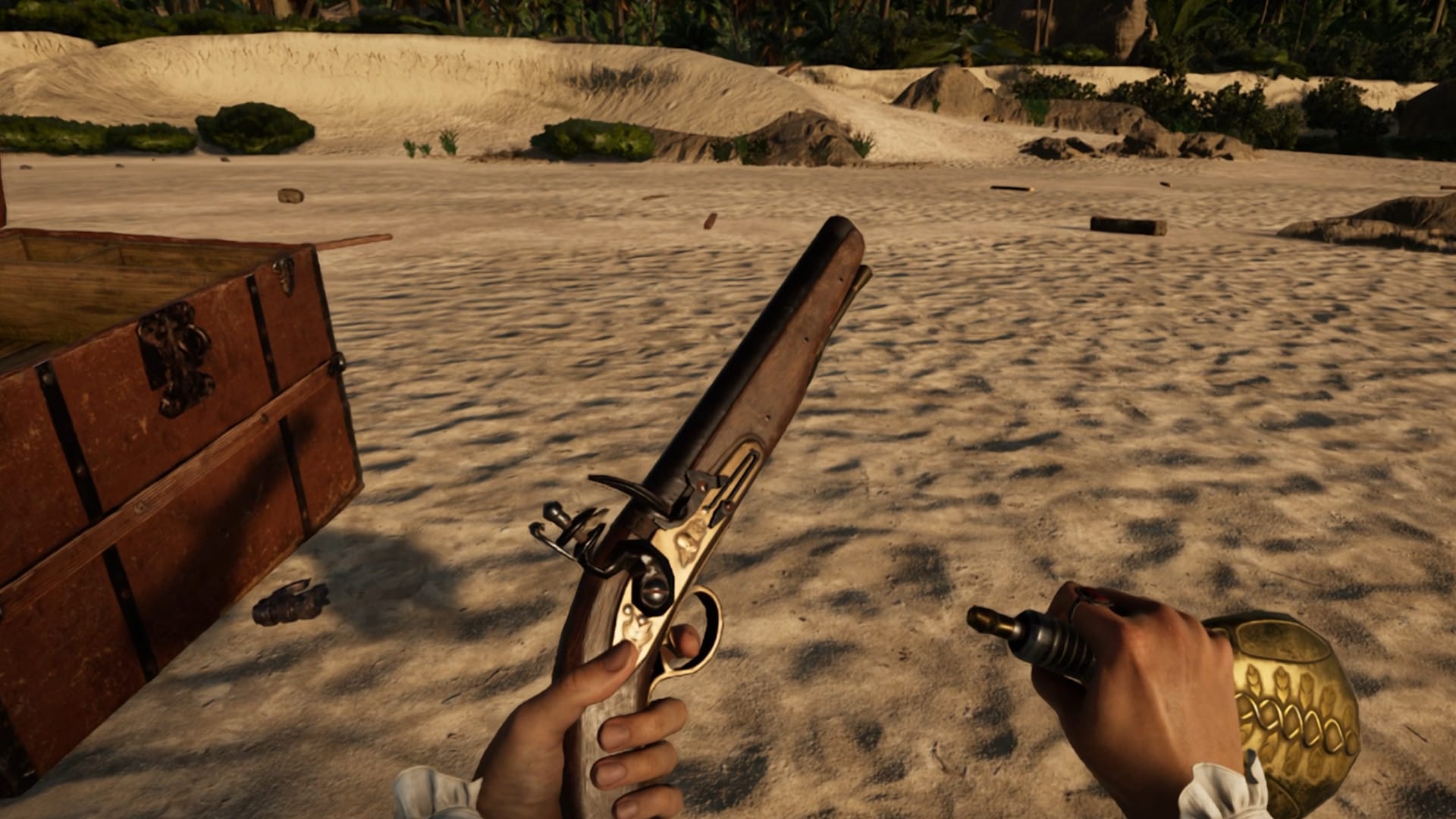 The island quickly shifts from friend to foe when day turns to night. Luckily, my fire keeps the nasty critters that come out during the dark at bay, and the next day, I found guns and a water bottle in more chests scattered along the shore. These required manual reloading, and I accidentally broke my bottle when I dropped something on it.