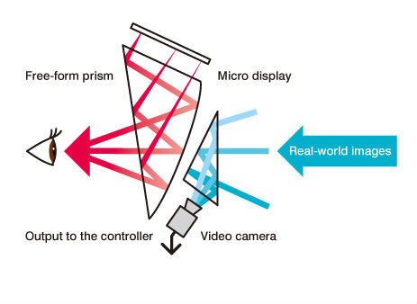 According to Canon, its mixed reality research dates back to 1997, but it wasn’t ready to become a product until 2012. The current system captures video from the real world where your eyes are, feeds it to a computer to be digitally enhanced, and then pipes the merged footage back to the headset so it can be displayed in front of your eyes. The system includes four cameras — one for each of the eyes and two more to capture position tracking information. Here’s a graphic of how the mixed reality functionality works: