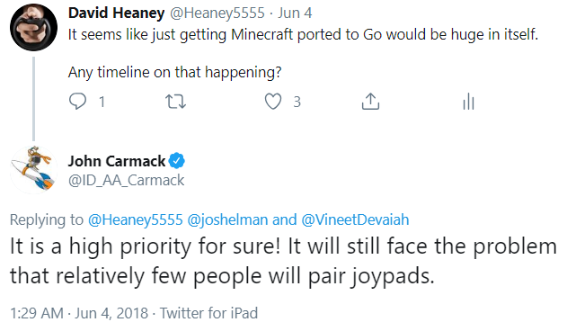 The delays of these projects mean that a lower priority task such porting to Go may have been heavily deprioritised. With the Nintendo Switch version of the game shipped however and the graphics DLC hopefully shipping soon, Minecraft for Go may be next on the agenda, and this may be what Carmack was referring to in his latest Tweet.