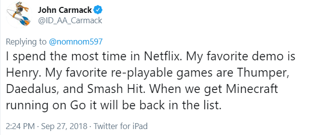When asked to list his favorite Go apps in September, Carmack ended his response with “When we get Minecraft running on Go it will be back in the list.”