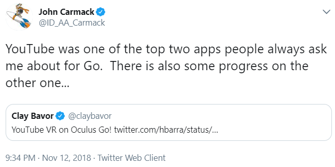 Yesterday, YouTube VR was released for Oculus Go. In his tweet about the release, Oculus CTO John Carmack stated that it was one of the two apps people always ask him about, and that there “is also some progress on the other one” – the other one almost certainly being Minecraft.