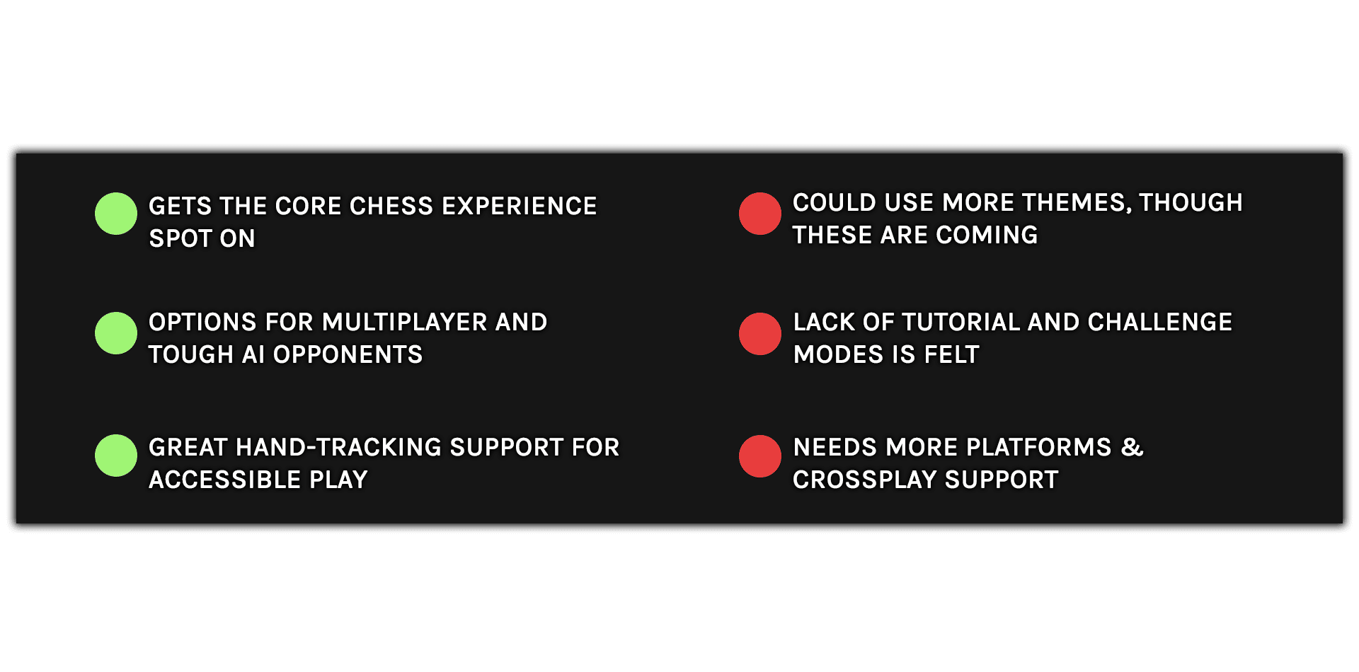 Chess Club does pretty much all it needs to do to solidify a position as the worthy chess game Quest has been missing. There are online and AI options and great visual polish whether you want the classic experience or something a little more novel, plus great hand-tracking support to help make the experience as accessible as possible. It could do with more in terms of modes and themes but Odders is likely to deliver on that front over time and, save for more versions of the game with cross-play support, there’s not really too much more you could ask of it. If you’re after an Oculus Quest chess obsession, look no further.