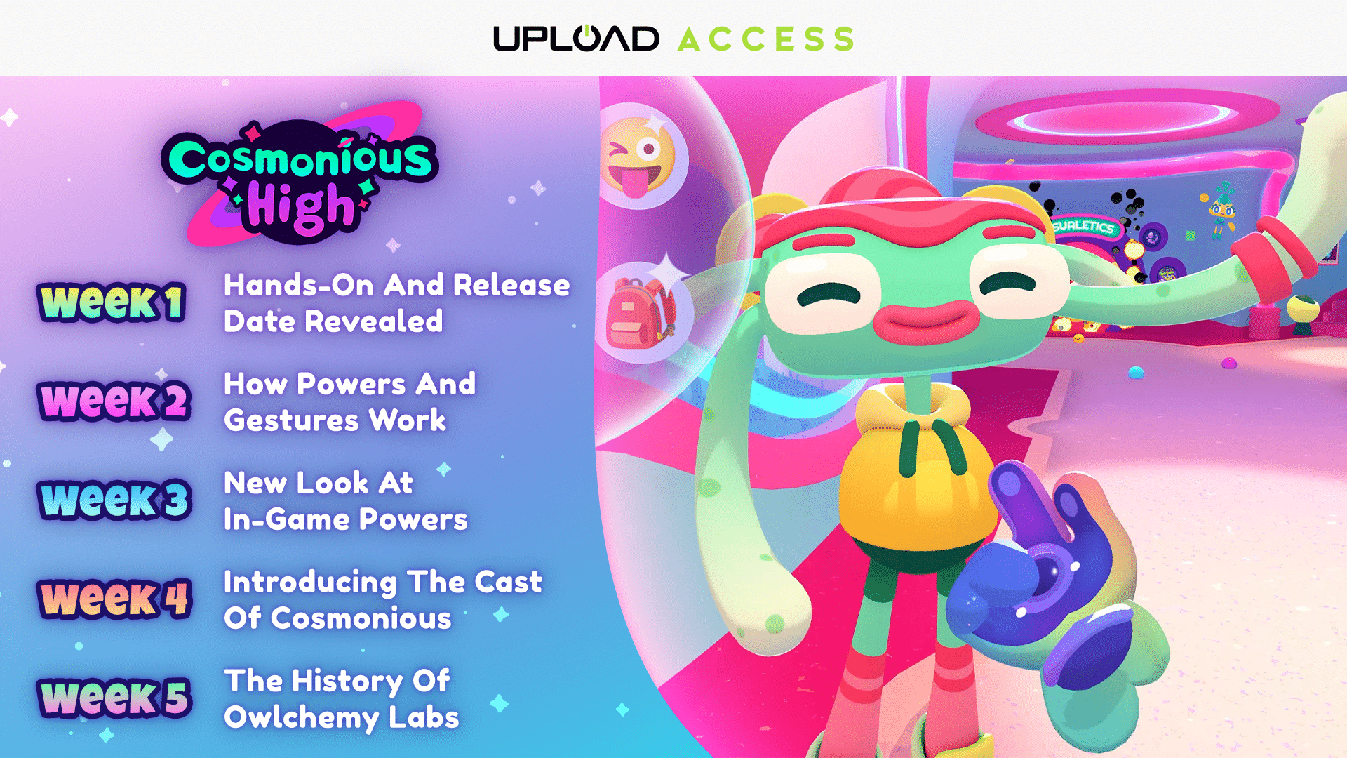 But don’t just take our word for it. We’re going to be featuring new looks at Cosmonious all month long as part of Upload Access. We’ve got a brand new preview of the game’s opening right here and, in the weeks to come, we’ll be talking to Owlchemy about the game’s powers and gestures systems, looking at the cast of characters, and taking a deep dive into the studio’s long history with VR. Take a look at the full schedule below.