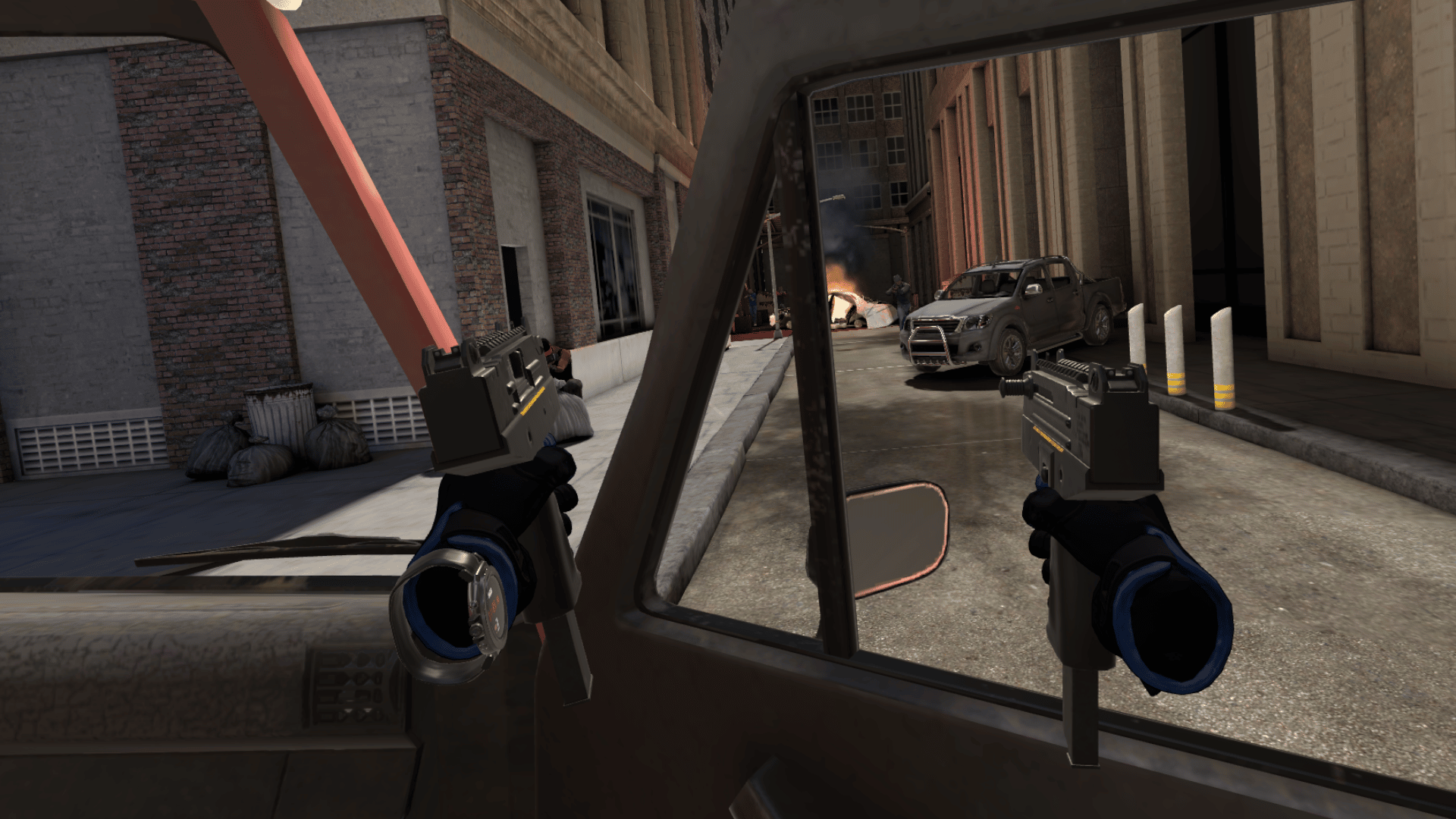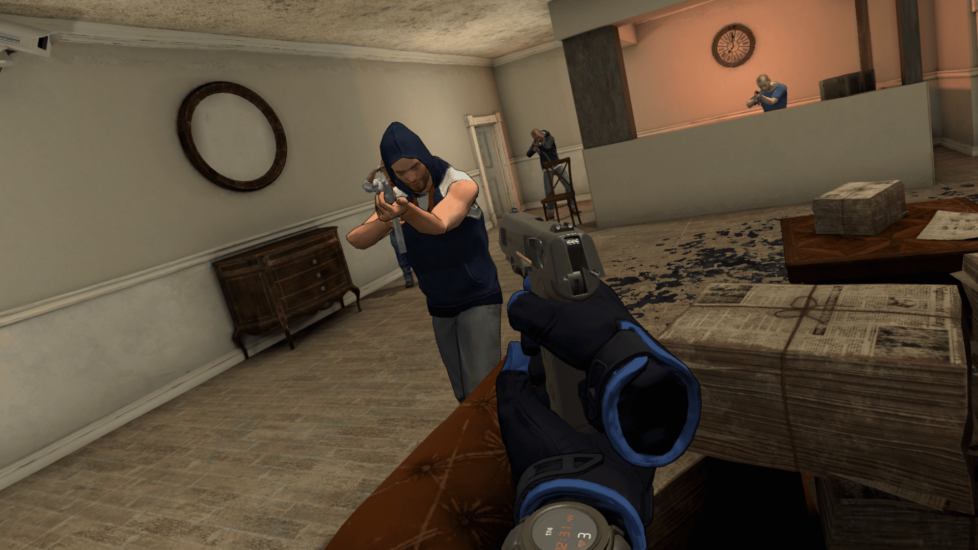 Every shootout in Crisis Brigade 2 takes place in a fixed location, so the game doesn’t use any form of artificial locomotion. Instead, each scene gradually moves you to new areas automatically with faded teleporting. Nausea risk is minimal but be careful – the gameplay has significant physicality. You’ll often be ducking for cover or leaning over virtual shields to fire shots, so expect to work up a sweat.