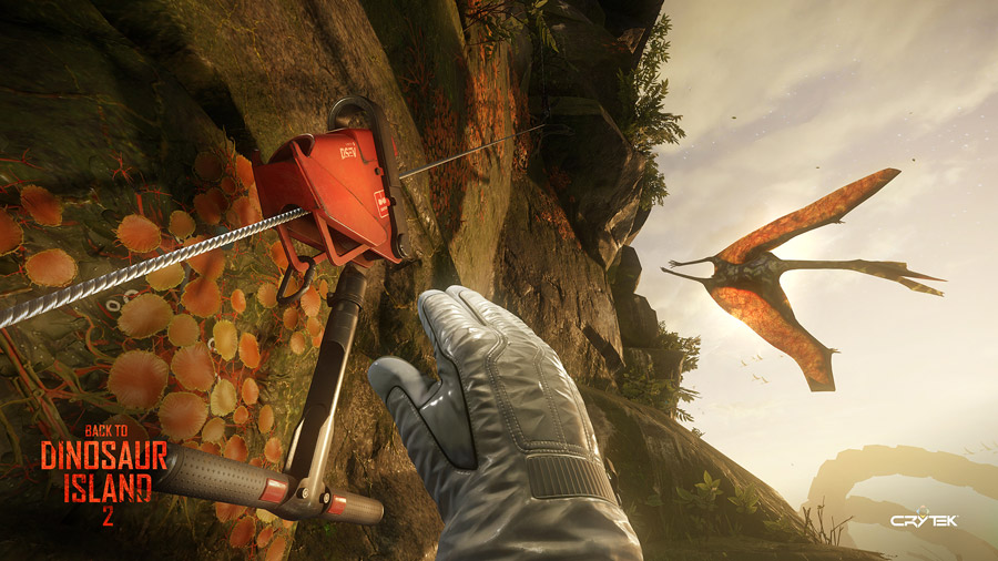 In addition to this already visually captivating game, dinosaurs are everywhere. And who doesn’t love dinos? You hear their thunderous roars in the background and you jerk suddenly to the right as a pterodactyl screeches past you on its insane downward descent. The trip up is filled with moments like an encounter with the a baby pterodactyl and its mother who is beckoning the baby to take its first flight. As it falls your heart sinks as it struggles to take flight, only to finally regain control and fly into the distance. Or perhaps its angry father who has decided to try and drop rocks on your head from the ledge above. Crytek even included some little hidden nuances like the ability to scrape lichen off the side of the mountain with your hands.