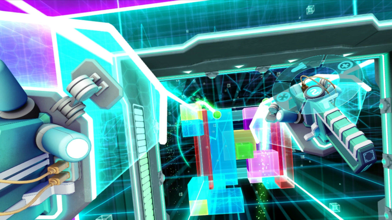 There’s definite skill involved in carefully hitting a ball toward the right block while managing your energy to destroy ones that get too close. You don’t want to run out of energy so you have to keep an eye out for the purple blocks and carefully time how frequently you collect and use the power-ups. Cyberpong also features well-thought out controls. Once you get the hang of it, switching to a power-up and then pressing the grip buttons to return to a traditional paddle is both fast and effective for accessing multiple abilities while not letting any balls get past. Also, it seems like the harder you swing at a ball with your paddles the more likely you are to send it in the direction you want. That said, even if you realize this it’s still hard to direct the ball exactly where you want it to go.