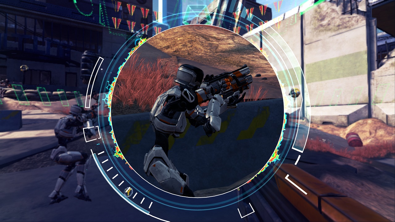 After I learned the basics of movement and combat, the pace picks up very quickly. By targeting cameras and robots around various levels, I could jump into new units and take control. At first I was only navigating my way through some buildings while narration played in my ear piece, but once I hit my first open field, that’s when the game’s real freedom was on display. Waves of enemy robots flooded into an open area ranging from shotgun-wielding and rifle-toting units, all the way to giant missile-launcher carrying mechs. Combat is just as much about jumping between units and staying alive as it is understanding how to utilize each robot’s strengths and weaknesses.