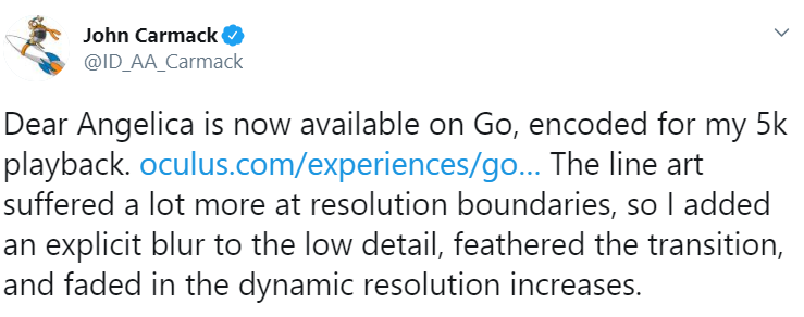 Carmack made custom tweaks to his player code for Dear Angelica. This kind of attention to detail really shows when viewing in the headset.