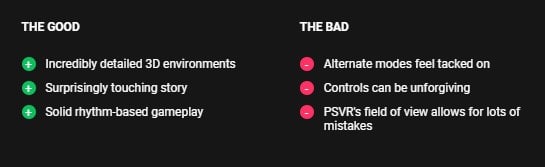 It takes some time to get used to, but is actually an extremely easy way to play, no matter which of the three difficulties – Easy, Medium, Hard – you play on. However, due to the PSVR’s field of view, you’re going to have to pay closer attention to exactly where you’re striking notes. During a handful of playthroughs of songs on a harder difficulty, I missed tons of notes simply due to the game not registering my hit on a certain key in my periphery. It’s tricky to get the hang of and can be unforgiving if you’re trying to learn, but does work well once you do.
