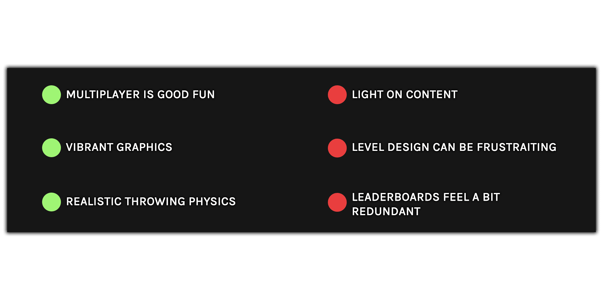 There’s a great concept within Disc Ninja but ultimately, Immersion’s frisbee/golf concept doesn’t completely nail the landing. Offering enjoyable gameplay, a vibrant presentation and entertaining multiplayer, the game’s held back by the odd frustrating level, barebones content and a surprising lack of comfort settings. If you’re playing alone, Disc Ninja won’t last too long, but find some friends to join in and you’ll have a good time.