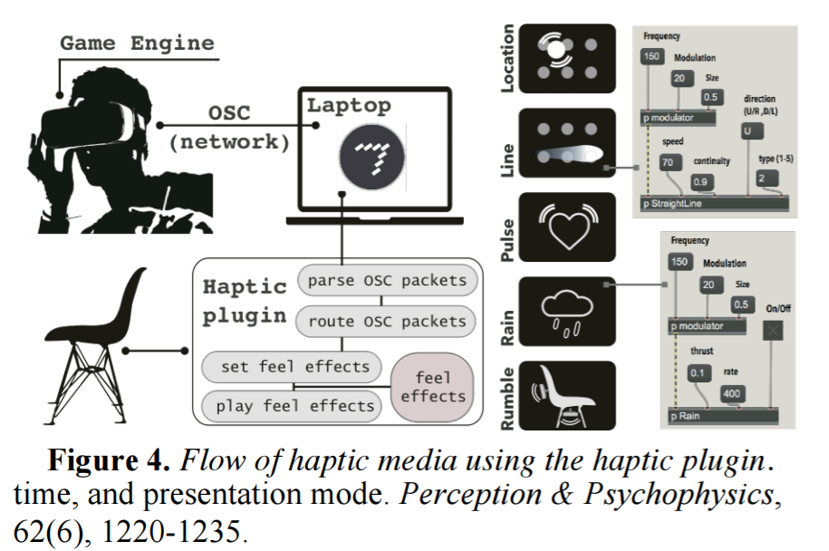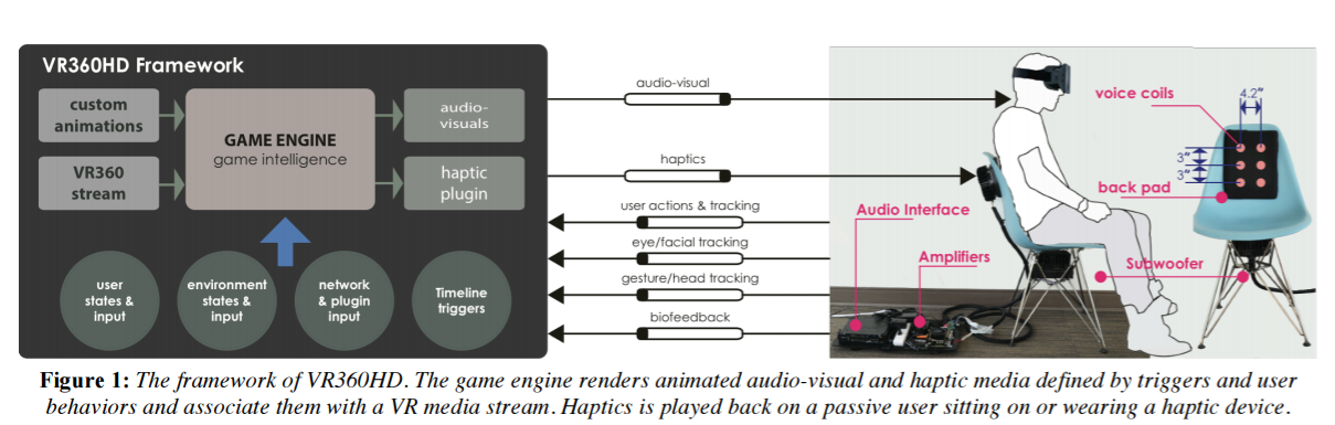 The paper details a ‘Haptic Chair’ that extends feedback beyond what you’ll get with position-tracked controllers like Oculus Touch and the Vive wands. The chair is fitted with six vibrotactile actuators on the back and two subwoofers on the seat and back that researchers claim “cover a significant portion of the human body” and could be applied to a range of seating options. A haptic playback and authoring plugin for Unity allows filmmakers to tailor feedback to their experience.