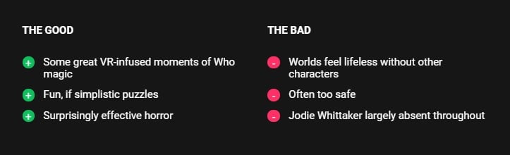 It’ll be enough to stop some fans in their tracks, so much so you could argue Maze Theory goes in a little too hard on the horror. That said, the concept of the Angels in VR is one that’s tough to pass up and the studio does the premise justice. I just would have liked to have seen more of the wonder and awe of many of the Doctor’s adventures to balance out the moodiness.