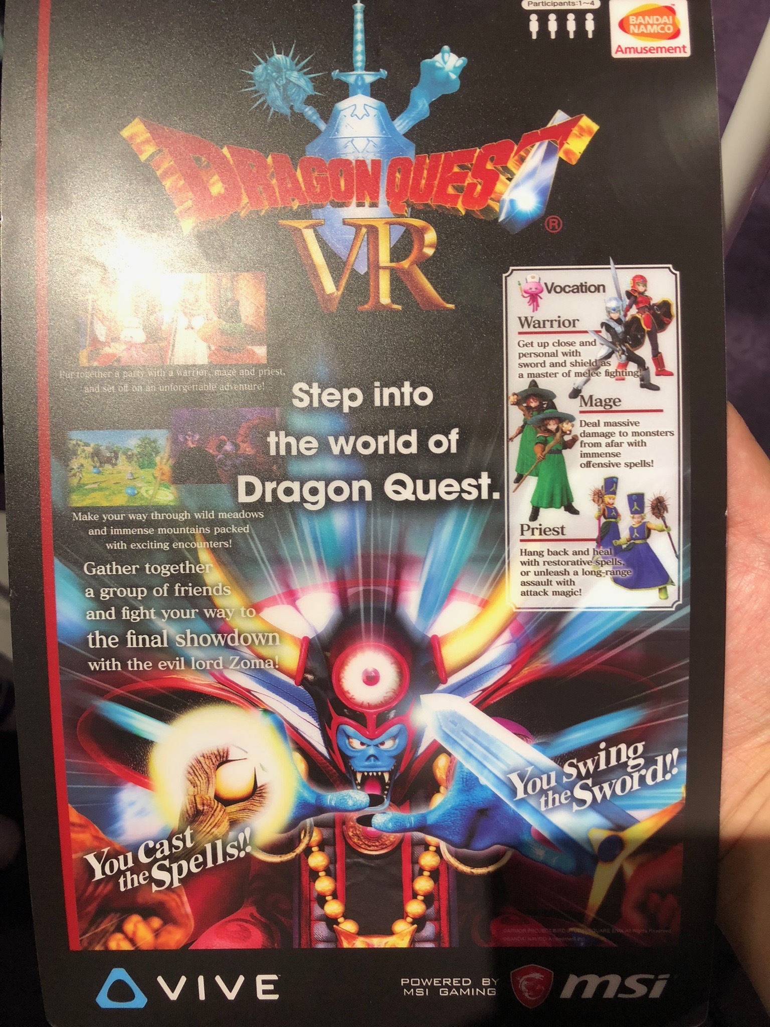 Dragon Quest VR made its debut this past April at VR Zone Shinjuku, a Bandai Namco-owned VR arcade located in the heart of Tokyo’s eye-popping Shinjuku district. It’s a first-person location-based experience that takes place on a huge 65 ft x 39 ft grid where multiple groups can play at the same time. Each team consists of four players and three different classes: two melee warriors, a mage, and a priest. Your goal is to fight through a series of battles before facing the powerful Zoma, an iconic Dragon Quest villain.